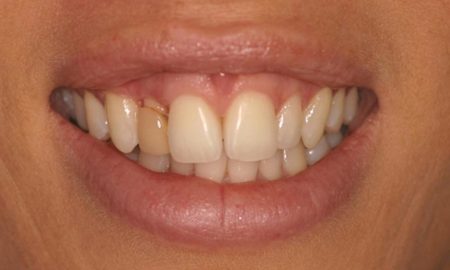 Between the first and second picture the patient had a minor soft tissue procedure which lifted part of the gum to a more aesthetic alignment in symmetry with the other side. Then we show a new bonded restoration. This is much like a porcelain veneer, although it is a composite material which will dull and discolour in time. This can also be done in porcelain for permant colour stability.